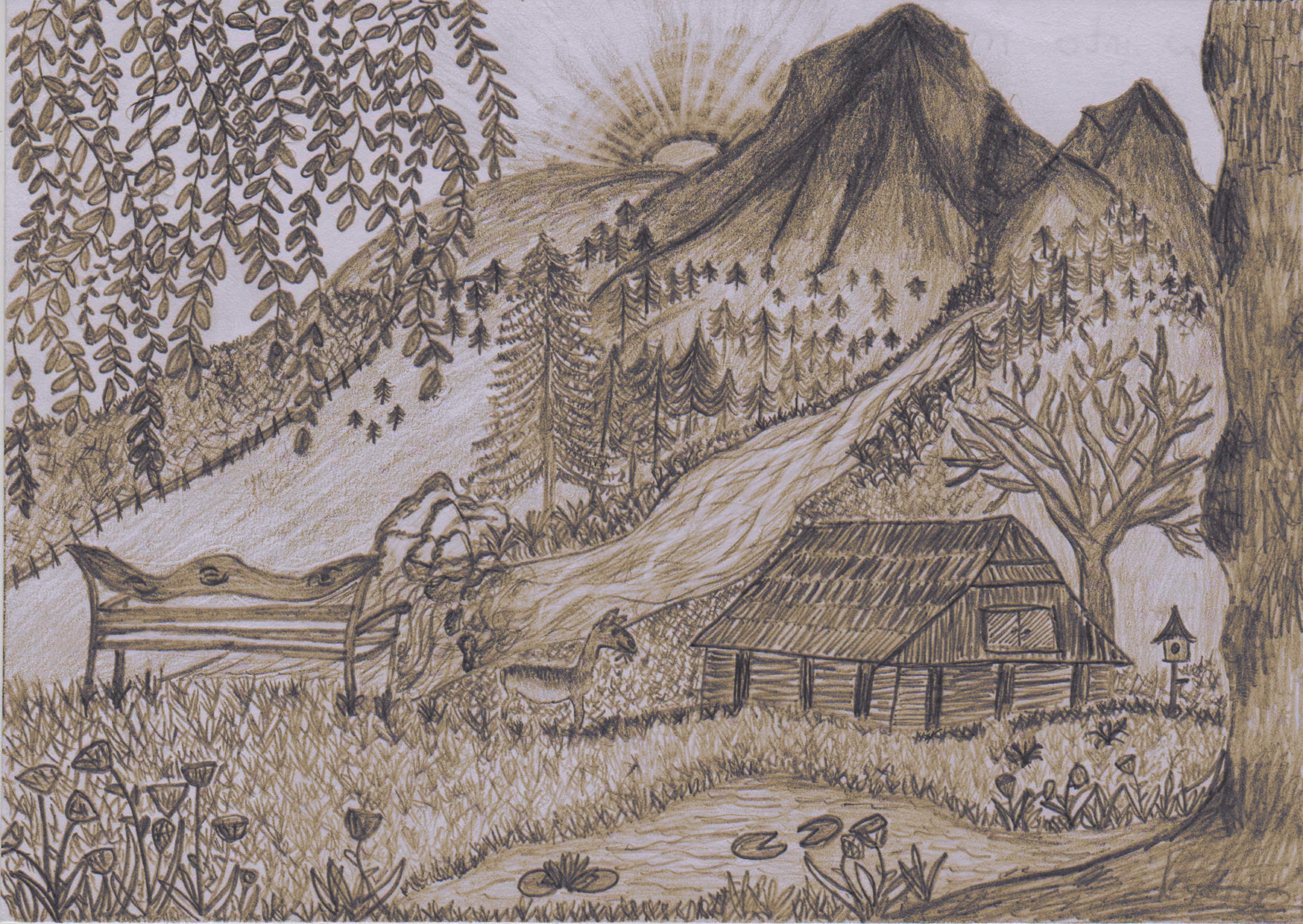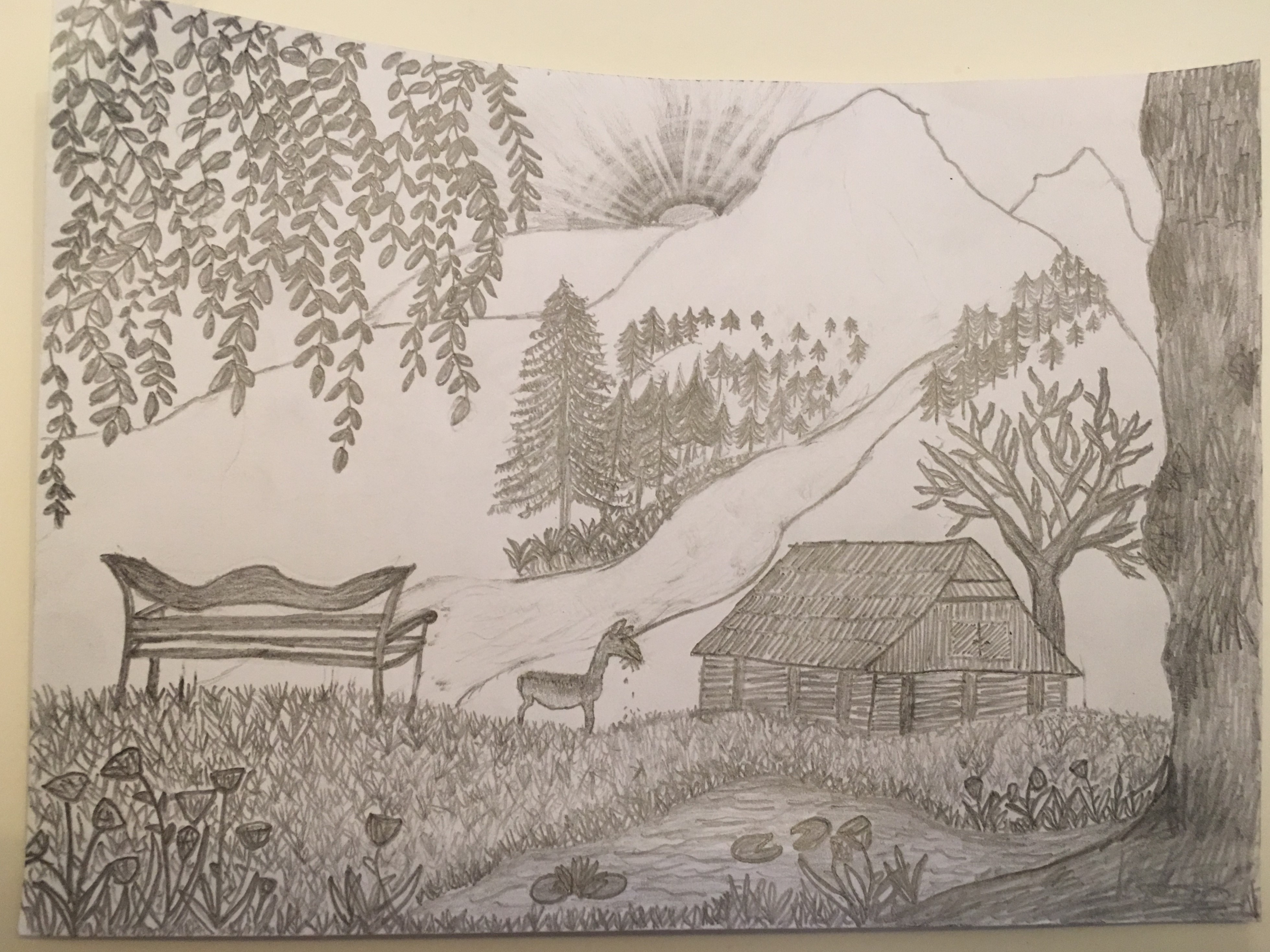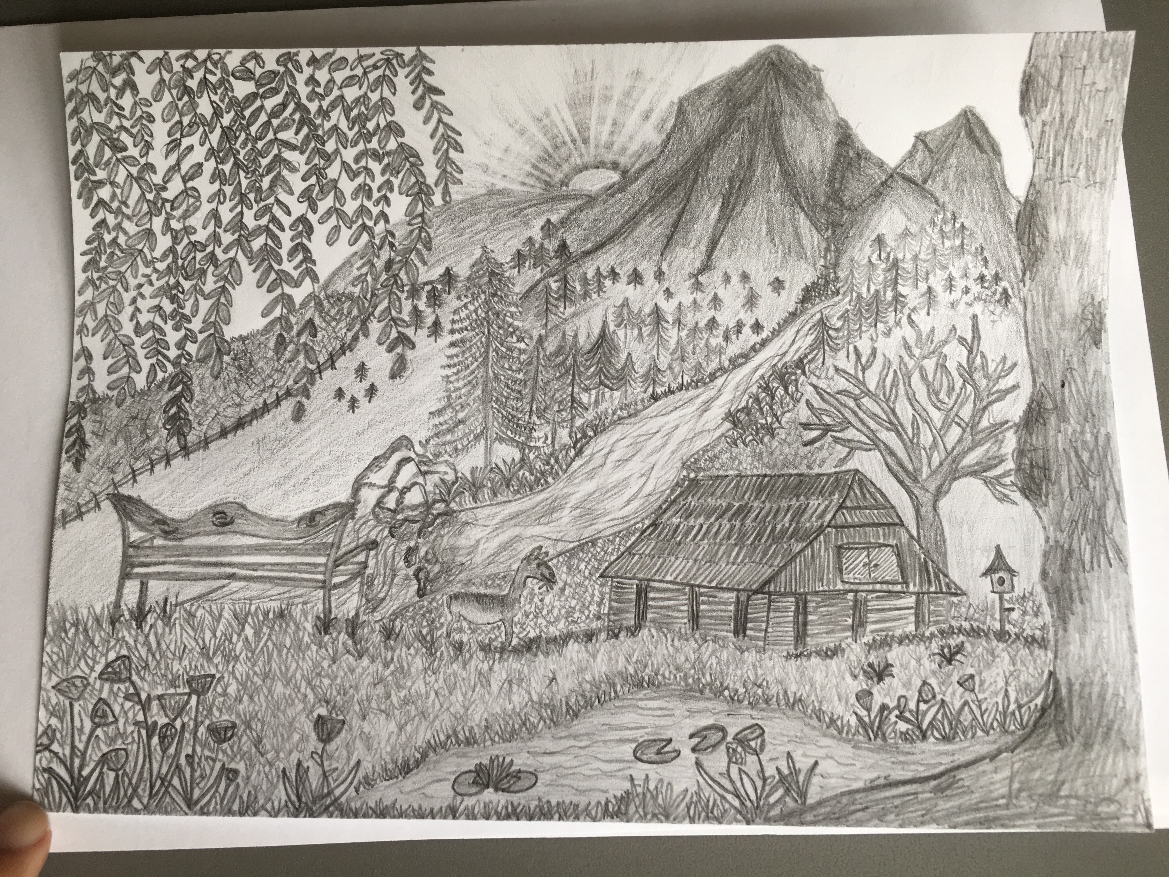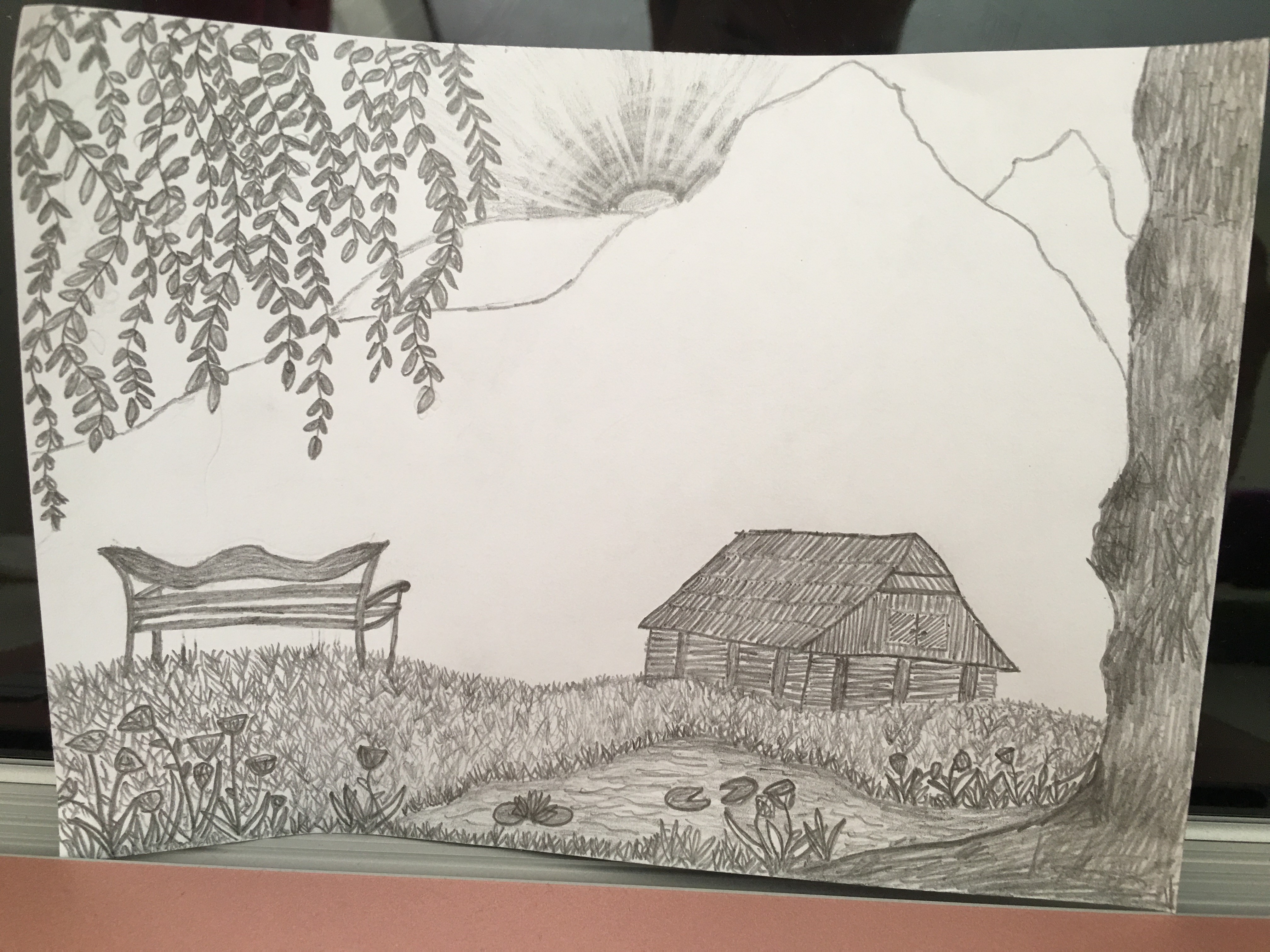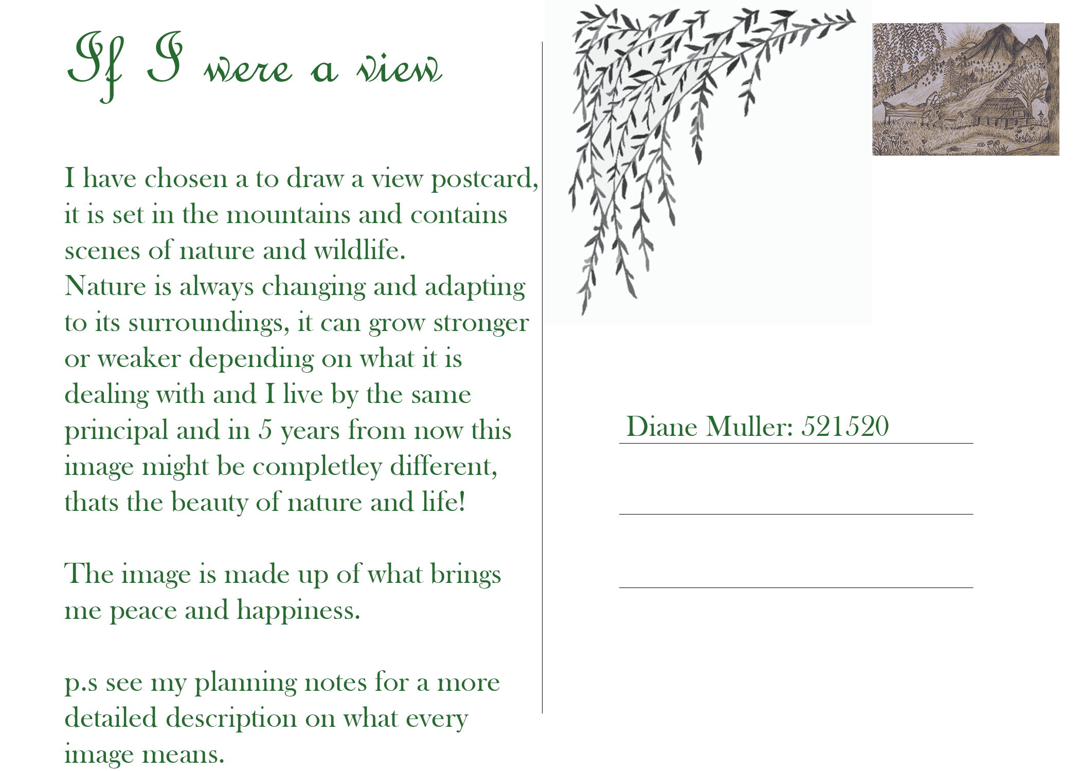 The idea is to draw a picture using pencil then scan it and make it look aged, I was planning on doing a few test runs and do some samples but to be honest I stared drawing and I could not stop, everything in the image has its own meaning and makes up who I am. I worked off the idea of a ‘View’ Postcard because it is a snapshot of history, showing a scene that has changed over time or not longer exists.