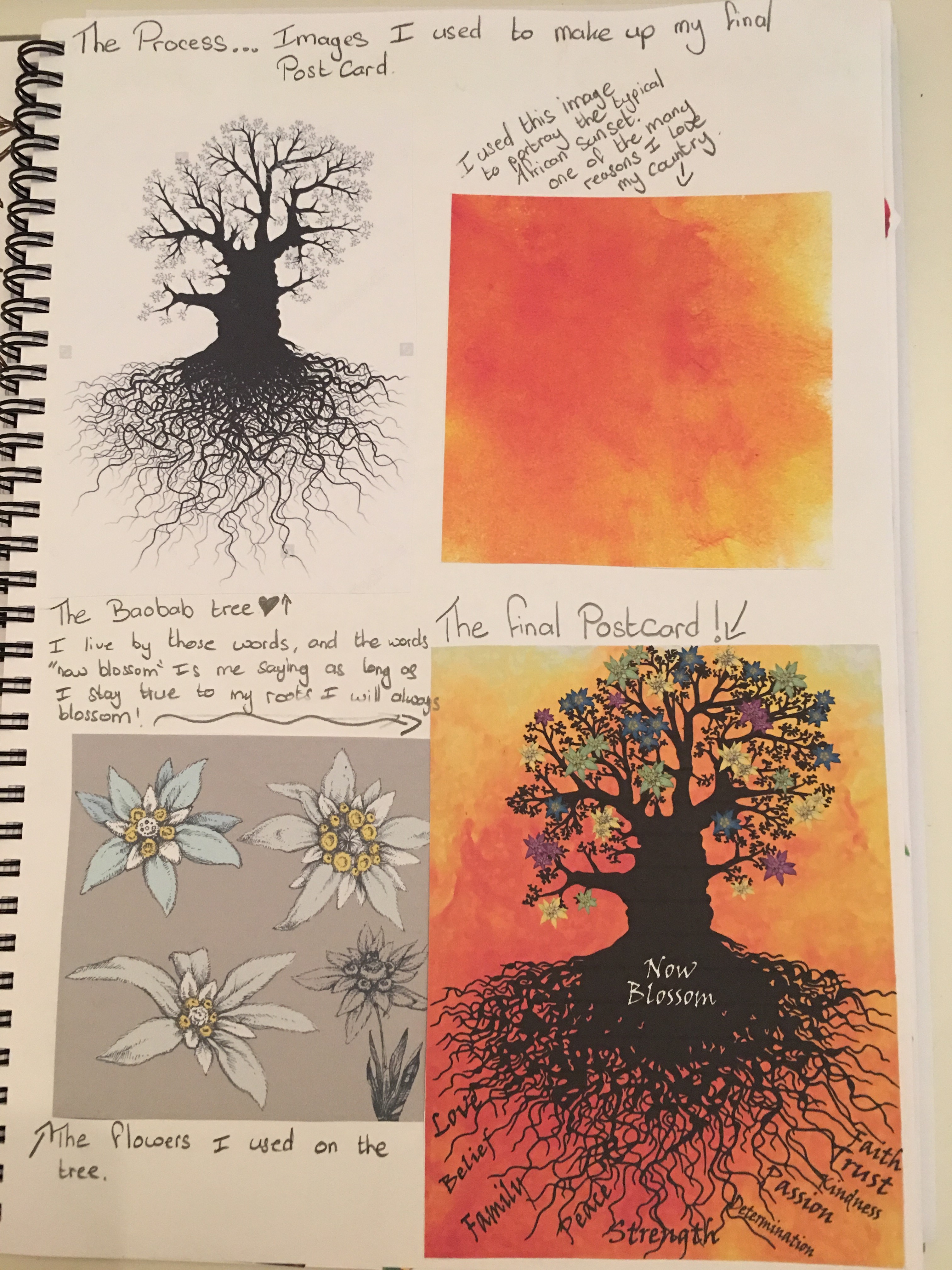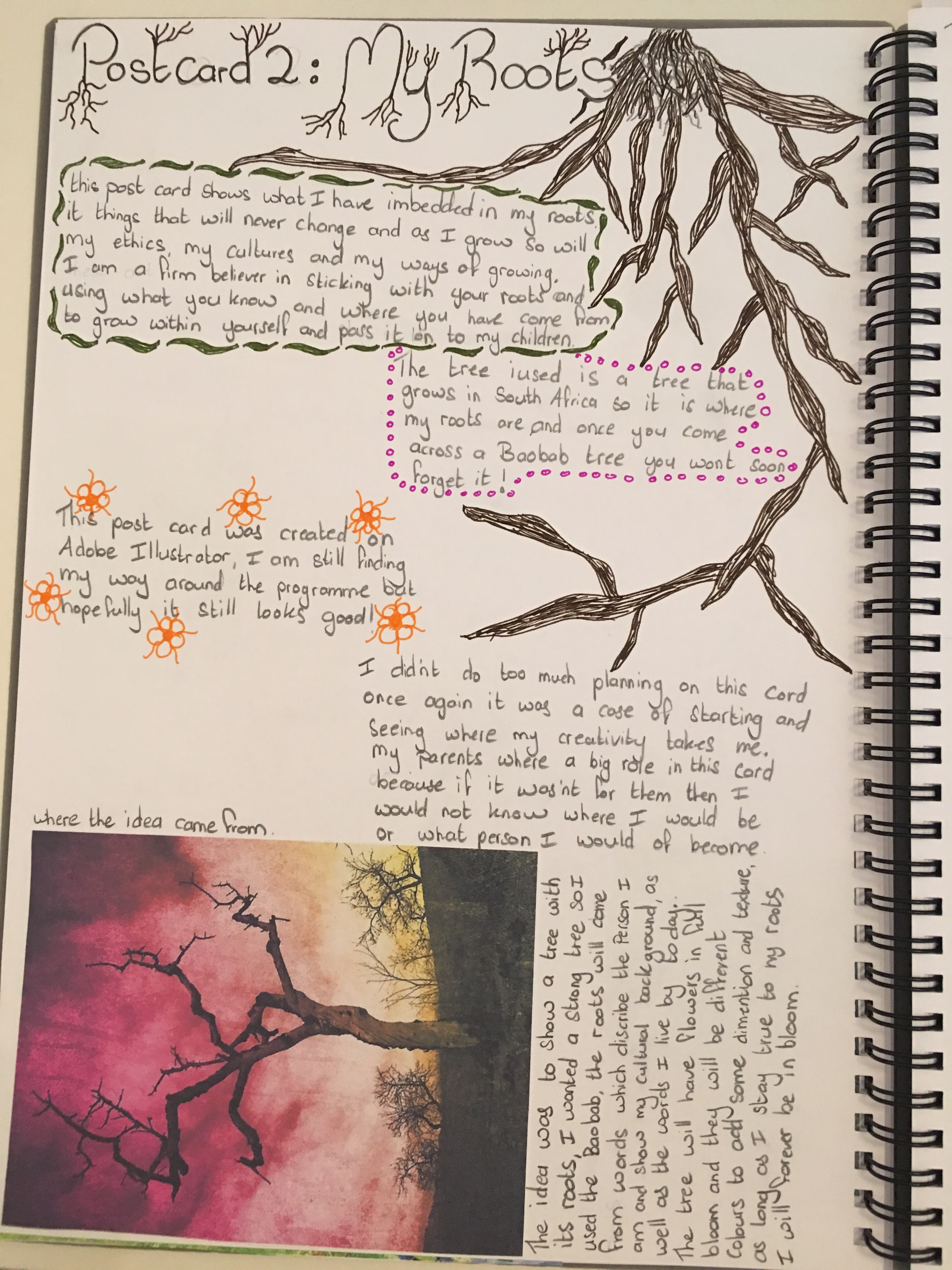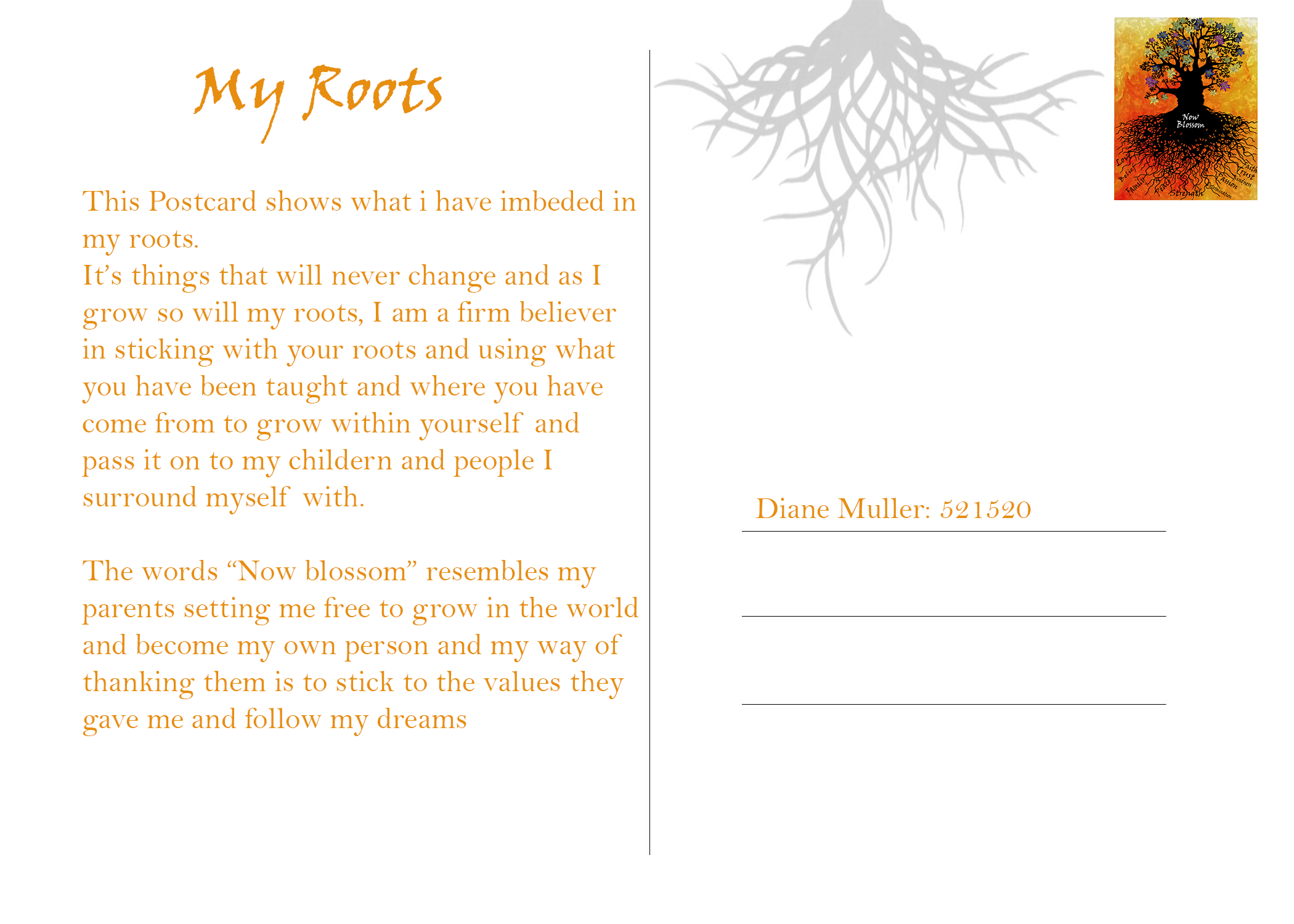 This Postcard shows what I have embedded in my roots, its things that will never change and as I grow so will my ethics, my culture and my ways of growing. I am a firm believer in sticking to your roots and using what you know and where you have come from to live your life in the best possible way.
