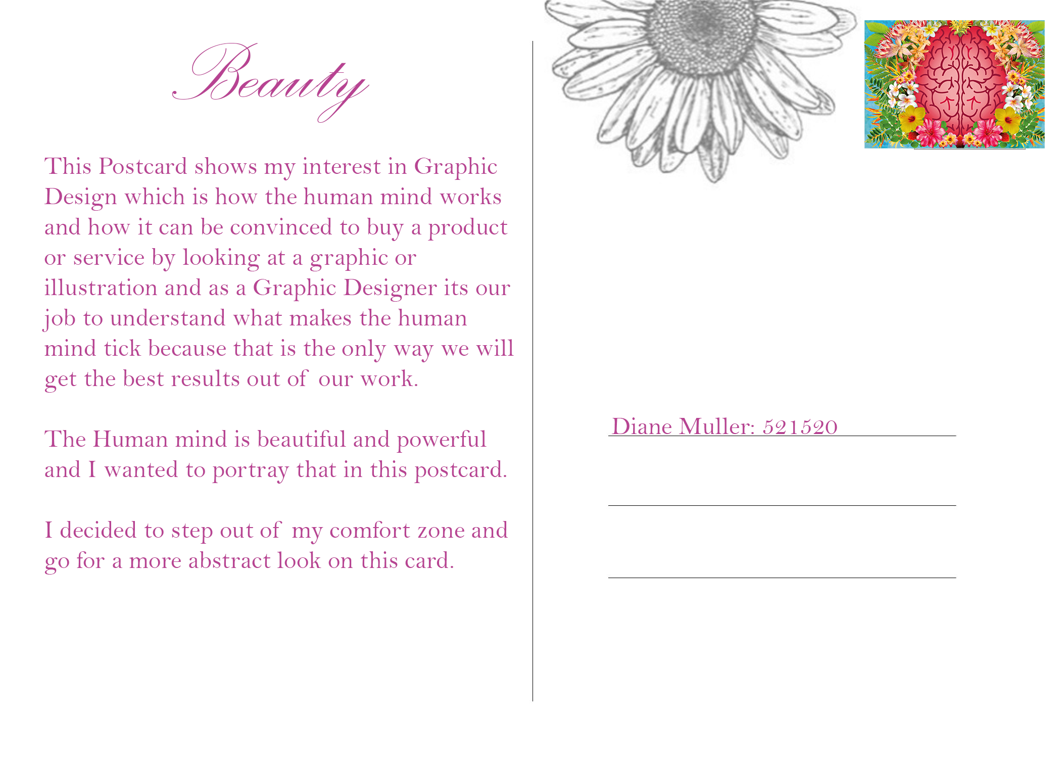 The human brain is beautiful and powerful and I wanted to combined my fascination with human behavior and my passion for graphic design in this postcard.