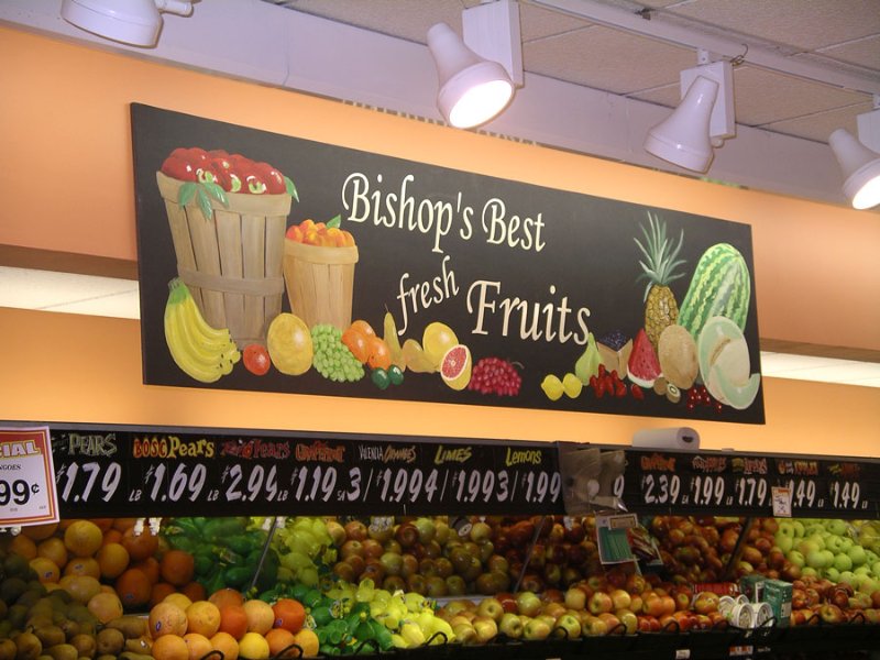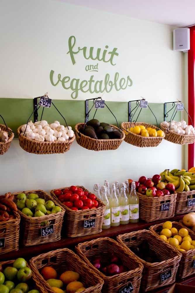 From what I can see stores like using the ‘chalk board’ effect and using farmers baskets ad display techniques to make the display more attractive and organic looking as if the fruit has just been brought over by the local farmer, making the fruit and veg attractive to the consumer.